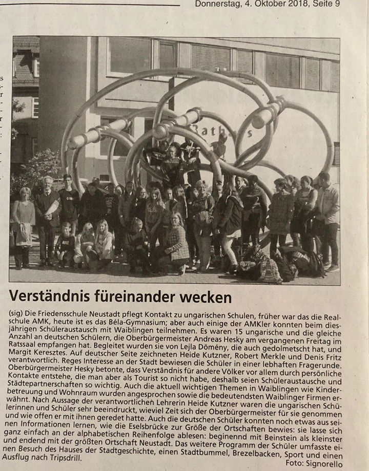 Szeptember 23-án 15 magyar diák utazott két kísérőtanárral (Döményné Dobosi Lejla és Keresztesné Kubovics Margit), menetrendszerinti járattal Stuttgartba / Waiblingenbe. Az éjszakai utazás fáradalmait gyorsan feledtette a lelelkes fogadtatás a neustadti vonatállomáson, ahonnan együtt mentünk az iskolába. Az igazgatónő köszöntését és az iskola bemutatását közös sportvetélkedő követte. Az első nap késő délután ért véget, amikor is végre haza mehetett mindenki a vendéglátó családjához. Minden nap remek programokon vehettünk részt; ellátogattunk Stuttgartba, a Mercedes-Múzeumba, és megcsodálhattuk a tartományi fővárost a Killesberg tetejéről. Bepillantást kaptunk a környék egyik leghíresebb péküzemének működésébe, ahol perecet is süthettünk. Andreas Hesky, Waiblingen főpolgármestere is fogadott bennünket, és örömét fejezte ki, hogy a testvérvárosi kapcsolat ezen a szinten is működik, hiszen a fiatalok jelentik a jövőt, és az idegen nyelv gyakorlása mellett nagyon fontosnak tartja, hogy megismerjük egymás országát, kultúráját, gondolkodását, és barátságok szövődjenek a részt vevők között. A kulturális programok mellett a legnagyobb sikert a tripsdrilli vidámpark aratta.