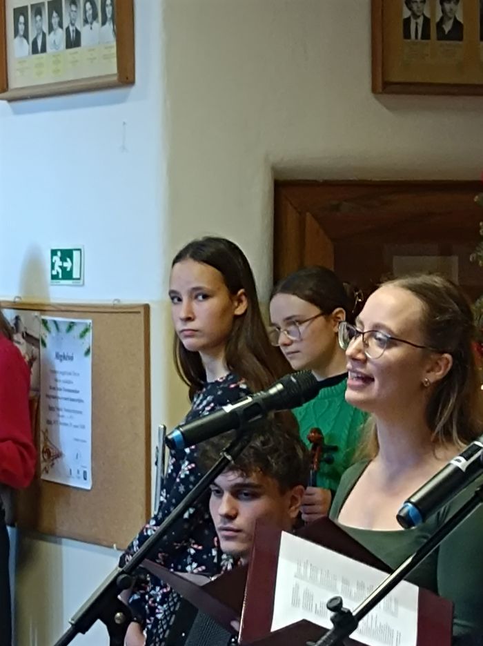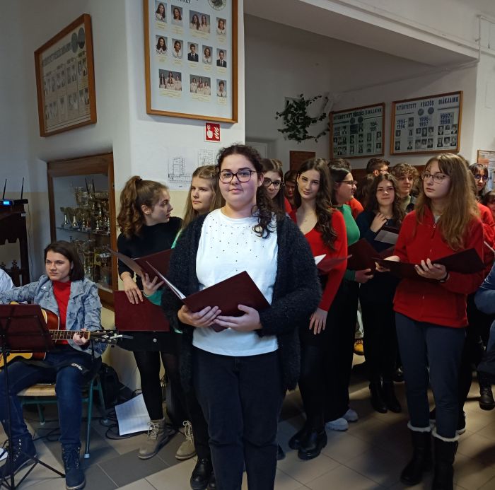 Közös karácsonyi éneklésre hívta össze az intézmény tanárait és diákjait idén is az év utolsó tanítási napján. Az ünnepi énekek dallama és szövege nemcsak meghitt hangulatot teremtett, hanem közösségi élményt is nyújtott. Az ünnep varázsára mindenki vágyik, és ez egy különleges alkalom volt arra, hogy hangszeres kísérettel és az énekkar segítségével ezt megélhessék a résztvevők.