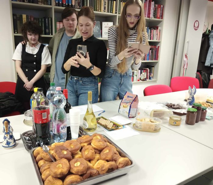 A könyvajándékozás kedves gesztusa igen csak nemzetközi közegben zajlott. A különböző nemzetiségű lelkes társaság az orosz farsang, a maszlenyica megünneplésére gyűlt össze az Orosz Központban. A társaság tagjait az kötötte össze, hogy mindenki beszélt magyar és/vagy orosz nyelven anyanyelvként vagy idegen nyelvként. Igazán izgalmas nyelvi kavalkád jött létre. Mindkét nyelven megismerhettük a maszlenyica eredetét, történetét és a hozzá kötődő szokásokat, és megkóstolhattuk az ünnep kötelező kellékét, a különböző formában és ízesítéssel készült palacsintákat.