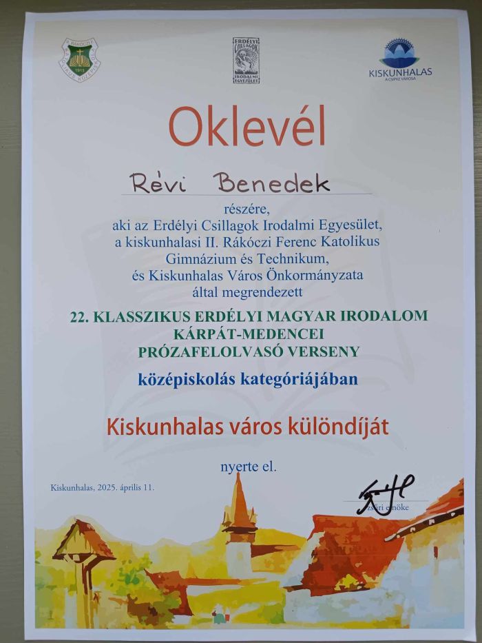 Április 11-én, a magyar költészet napján rendezték meg Kiskunhalason a 22. Klasszikus erdélyi magyar irodalom Kárpát-medencei prózafelolvasó versenyt. A középiskolások kategóriájában Révi Benedek 10.A osztályos tanulónk képviselte iskolánkat. A versenyen Makkai Sándor Táltoskirály című regényéből kellett kisorsolt részletet felolvasni.