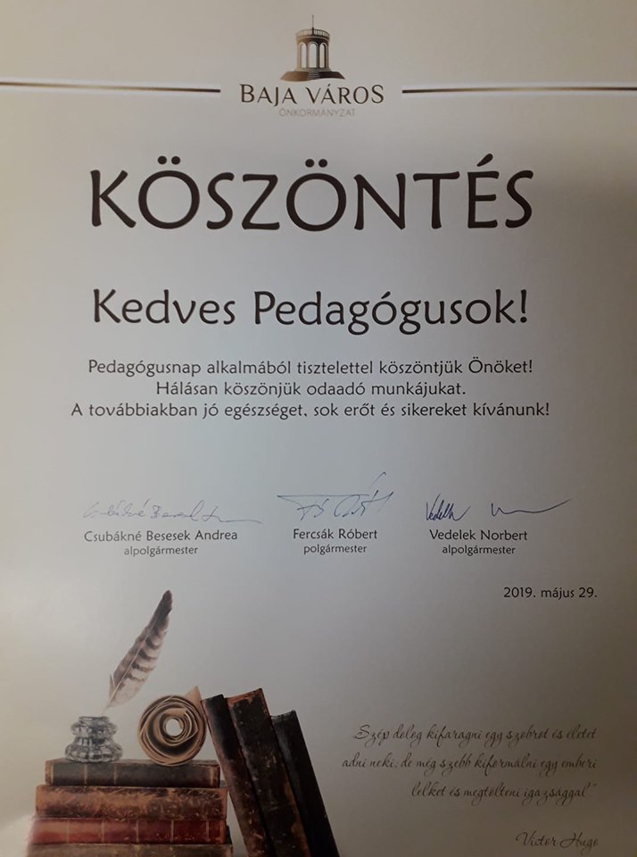 Emlékeztetőül jelzem, hogy első tanítási napunk 2019. szeptember 2-a. A tanévnyitó ünnepséget ezen a napon 8 órakor tartjuk, megjelenés egyenruhában.