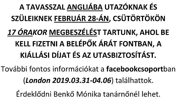 2019. február 7-én (csütörtökön) 17 órakor gimnáziumunkban szülői értekezletet tartanak az osztályfőnökök. 18 órától fogadóóra keretében találkozhatnak a szülők a szaktanárokkal.