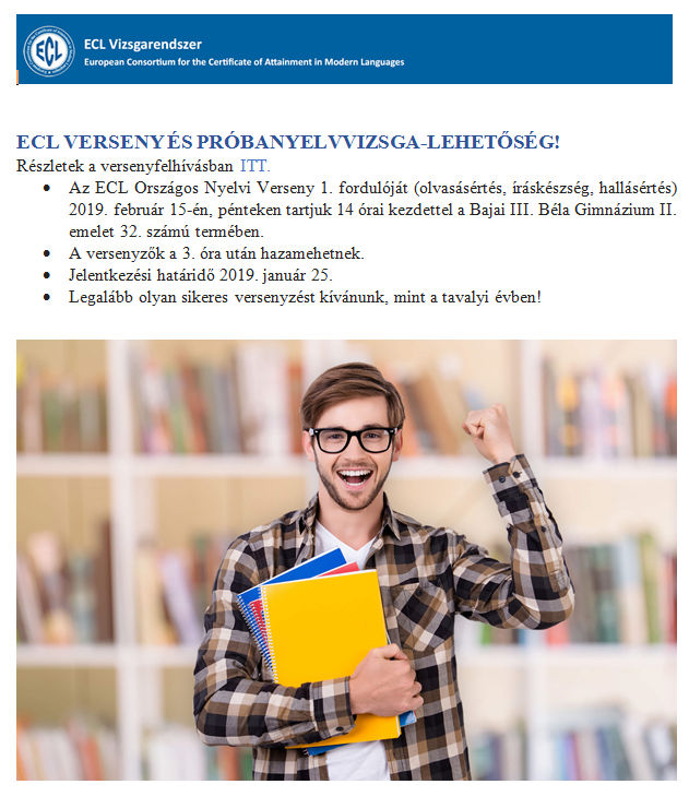 Az ECL Országos Nyelvi Verseny első fordulóját 2019. február 15-én, pénteken, 14 órától tartjuk a Bajai III. Béla Gimnázium (Baja, Szent Imre tér 5.), II. emelet 32. számú termében. Kérjük, hogy a verseny megkezdése előtt 15 perccel jelenjél meg a helyszínen.