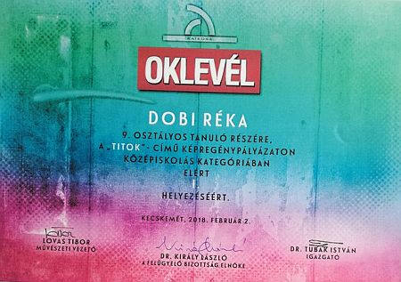 A megyei Titok képregény pályázaton Dobi Réka (9.D) 1. helyezést ért el.