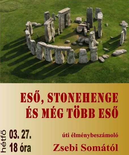 Zsebi Soma március 27. 18 órakor tart élménybeszámolót a városi könyvtárban Eső, Stonehenge, és még több eső címmel.