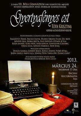 A bajai III. Béla Gimnázium sok szeretettel meghív minden érdeklõdõt immár hagyományos zenés irodalmi rendezvényére, a GYERTYAFÉNYES EST-re. Az idei évben Tóth Krisztina kortárs magyar költõnõ verseibõl készített összeállítást az est szervezõje, Radva László. Az est zenei rendezõje, Pethõné Kõvári Andrea ezúttal XX. századi zenei mûveket válogatott a költemények köré.