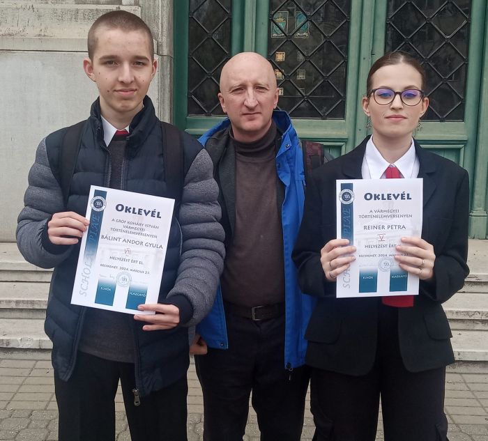 A 10. osztályosok Vármegyei történelemversenyén Reiner Petra 10.D osztályos tanuló szerepelt, és végül az 5. helyen zárta a megmérettetést. (Felkészítő tanára: Hegyi Cecília.)