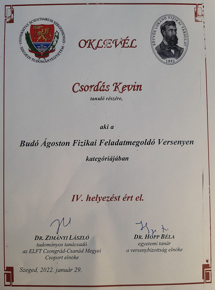 A Budó Ágoston Fizikai Feladatmegoldó Versenyen - melyet az SZTE Fizikai Intézete 1975-től rendez meg - Csordás Kevin (12.B) 4. helyezést ért el.