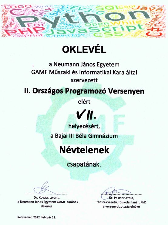 A Neumann János Egyetem GAMF Műszaki és Informatikai Kara által szervezett II. ORSZÁGOS PROGRAMOZÓ VERSENY döntőjében A Bajai III. Béla Gimnázium Névtelenek nevű csapata 7. helyezést ért el. A csapat tagjai: Tallér Máté István (12.B), Csordás Kevin (12.B) és Kovács Botond (12.A).
