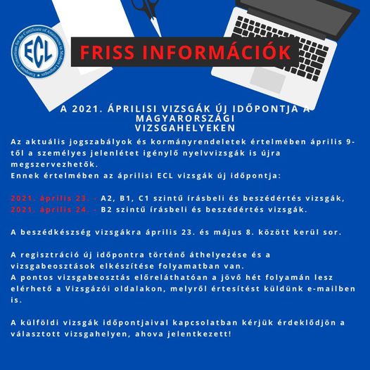 Meghosszabbították a jelentkezési határidőt az áprilisi ECL nyelvvizsgára. Az on-line jelentkezési határidő: március 15. (hétfő).