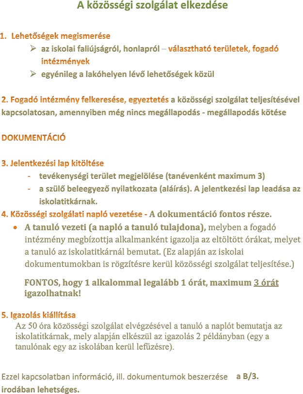 1. A közösségi szolgálat –fogalma Nemzeti köznevelési törvény (Részlet a nemzeti köznevelésről szóló 2011. évi CXC. törvényből) A „közösségi szolgálat: szociális, környezetvédelmi, a tanuló helyi közösségének javát szolgáló, szervezett keretek között folytatott, anyagi érdektől független, egyéni vagy csoportos tevékenység és annak pedagógiai feldolgozása.” 2012. szeptember 1-jén hatályba lépő nemzeti köznevelésről szóló 2011. évi CXC. törvény szerint az érettségi bizonyítvány kiadásának feltételeként ötven óra közösségi szolgálat elvégzését írja elő, mely a 2015. január 01-jével az alábbiak szerint módosult: 6. § (4) A középiskola elvégzését közvetlenül követő érettségi vizsgaidőszakban az érettségi vizsgák megkezdésének feltétele ötven óra közösségi szolgálat elvégzésének igazolása, kivéve a) a felnőttoktatásban részt vevő tanulókat és b) azon sajátos nevelési igénylő tanulókat, akiket a szakértői bizottság javaslata alapján a közösségi szolgálat alól az igazgató határozatban mentesített. A szolgálat megkezdéséhez szükséges nyomtatványok, (Kitöltésután a kapcsolattartó/osztályfőnök által megbeszéltek szerint kell leadni.):