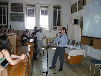 ÉRTÉKELŐ ÓRAAz értékelő órákat azzal kezdtük, hogy kiscsoportokba szervezett minket Radva László tanár úr. Minden csoport más-más feladatot kapott: adott témákat kellett értékelni, megbeszélni (az utazások, a témanap, a Bolyaiban folyó oktatás, a megvalósult projektek). A megbeszélés után minden csoport beszámolt, majd szabadon bárki hozzáfüzhette gondolatait, észrevételeit az elhangzottakhoz. Ezután fényképes illusztrációval egybekötött kötetlen élménybeszámoló következett, ahol olyan eseményeket is elmeséltünk, amelyek nem tartoztak szorosan a „hivatalos” programhoz: itt derült ki, hogy ki hol bulizott, a szombati kirándulások élményei, stb. Még az kiderült, hogy bizony szerelmi kapcsolat is kialakult: az egyik lánynak elkezdett udvarolni egy marosvásárhelyi fiu. Jókat nevettünk az élményeken, anekdotákon, a legjobb része ez volt az értékelő órának. Külön része volt az értékelő órának, hogy mindenki a saját osztályában az osztályfőnöki órán is beszámolt az élményiről. Fényképeket vittünk be illusztrálásképpen, és válaszoltunk a fölmerült kérdésekre. Sokan kedvet kaptak a leendő látogatásokban való részvételre. Azért mi nem szeretnénk kimaradni a jövő évi programokból!