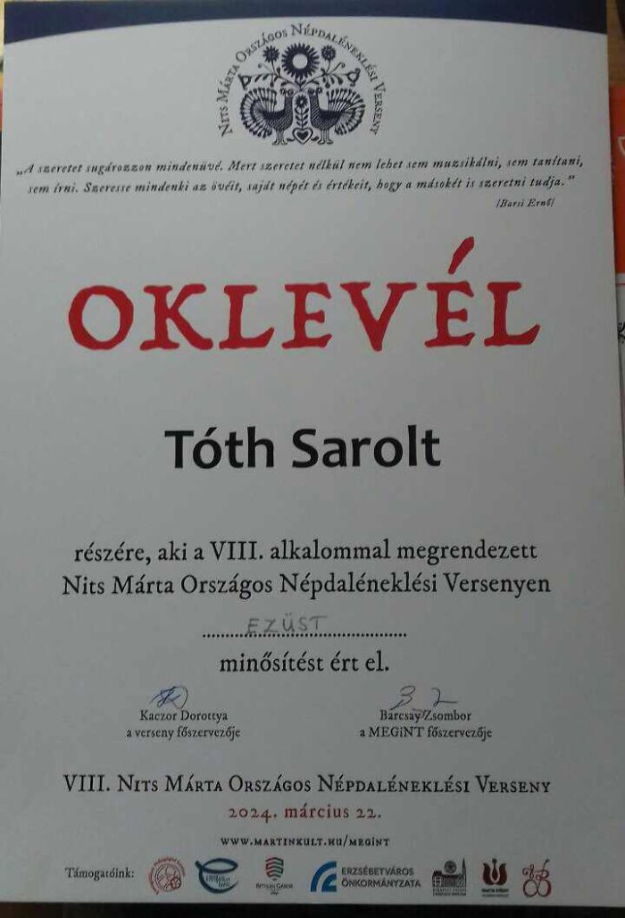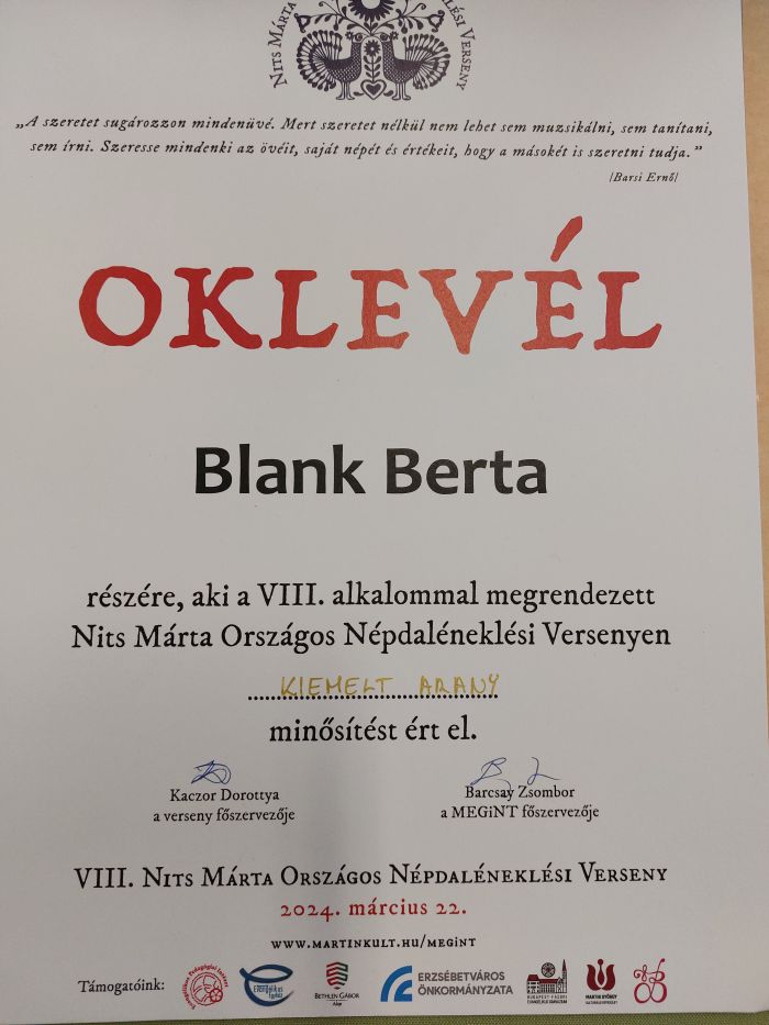 Március 22-én a Nits Márta Országos Népdaléneklési Versenyen Blank Berta 11.C osztályos tanuló kiemelt arany, Tóth Sarolt 9.D osztályos tanuló ezüst, Koprivanacz Luca 8.B osztályos tanuló pedig arany minősítést szerzett.