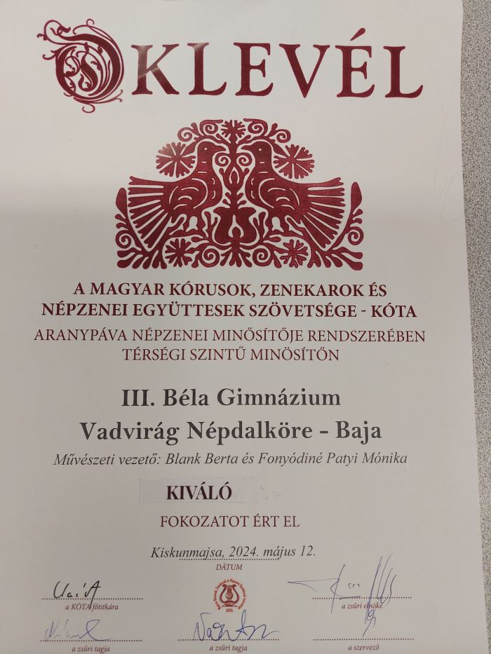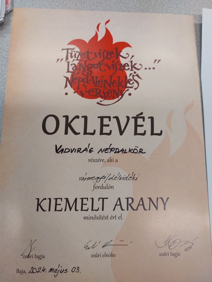 Május 3-án került megrendezésre a Tüzet viszek, lángot viszek ...Gyermek és Ifjúsági Minősítő Népdaléneklési Verseny vármegyei/délvidéki fordulója, ahol Blank Berta 11.C osztályos tanuló kiemelt arany és a Vadvirág népdalkör is kiemelt arany minősítést szerzett.