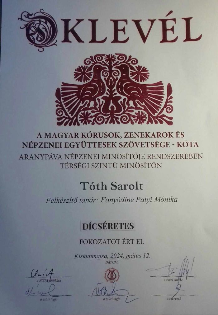 Kiskunmajsa adott otthont a május 12-én zajló KÓTA aranypáva népzenei minősítője rendszerében térségi szintű minősítésnek, ahol a Vadvirág népdalkör kiváló, Tóth Sarolt 9.D osztályos tanuló pedig dicséretes minősítést szerzett, így az országos minősítésre mehetünk.