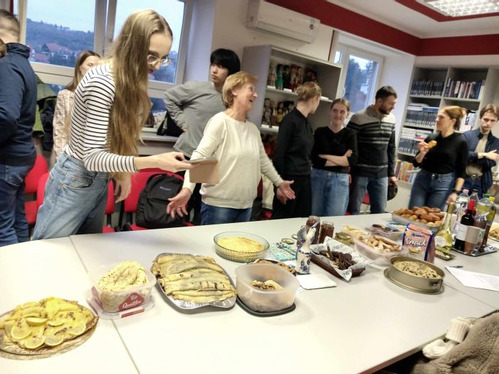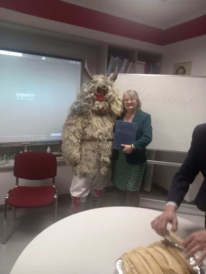 A könyvajándékozás kedves gesztusa igen csak nemzetközi közegben zajlott. A különböző nemzetiségű lelkes társaság az orosz farsang, a maszlenyica megünneplésére gyűlt össze az Orosz Központban. A társaság tagjait az kötötte össze, hogy mindenki beszélt magyar és/vagy orosz nyelven anyanyelvként vagy idegen nyelvként. Igazán izgalmas nyelvi kavalkád jött létre. Mindkét nyelven megismerhettük a maszlenyica eredetét, történetét és a hozzá kötődő szokásokat, és megkóstolhattuk az ünnep kötelező kellékét, a különböző formában és ízesítéssel készült palacsintákat.