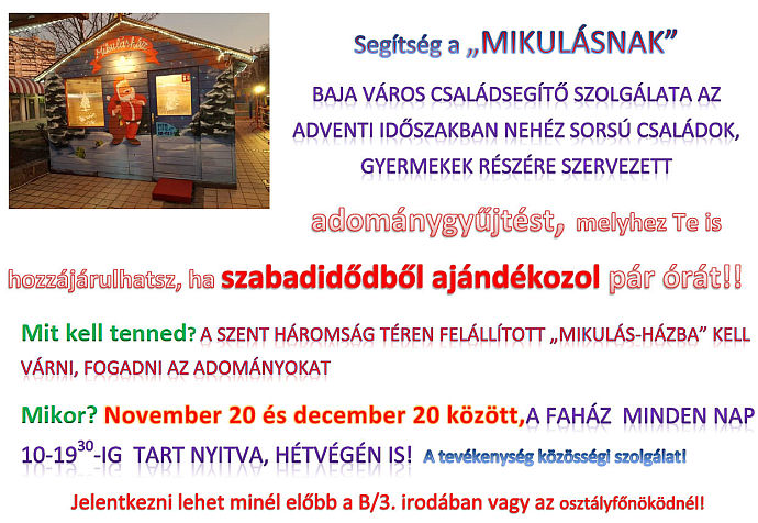 Az idén is szeretnénk az iskolát az adventi időszakra feldíszíteni, amihez az Önök segítséget is kérnénk. A díszítés 2019. november 23-án 9 órakor lesz. Kérnénk a lelkes szülőket, hogy metszőollót, drótot, ragasztópisztolyt hozzon magával, aki tud, hogy ne kelljen egymásra várnunk.