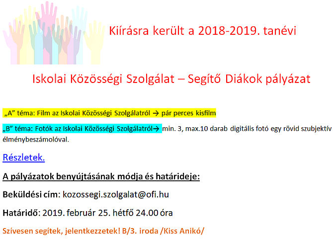 Az értékelő lapok átvételének időpontja: 2019. február 7-én csütörtökön, a II. emeleti informatika teremben, 8.00-16.00 óráig.