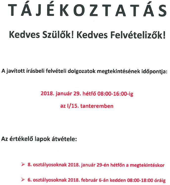 A 6. osztályosok felvételi értékelő lapjainak átvételére 2018. február 6-án, kedden 8 és 18 óra között van lehetőségük a kedves Szülőknek!