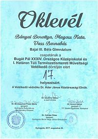 A Bugát Pál XXXIV. Országos és I. Határon Túli Természetismereti Műveltségi Versenyen a bélások a 17. helyen végeztek. A csapat tagjai: Bányai Dorottya, Magoss Kata Vass Barnabás.