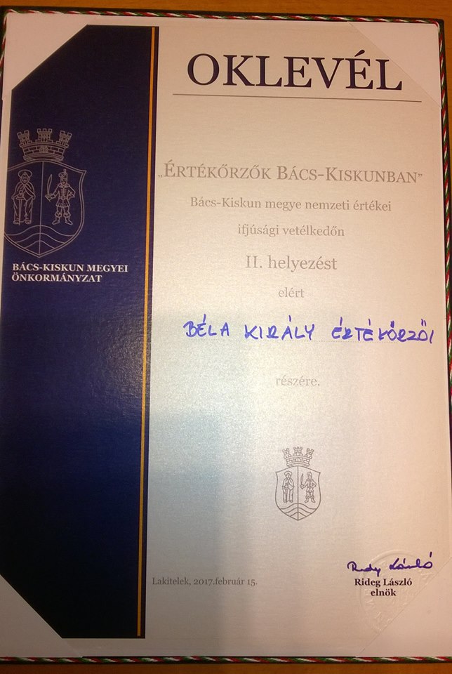 Gimnáziumunk csapata a Bács-Kiskun Megyei Önkormányzat által kiírt "Értékőrzők Bács-Kiskunban" verseny megyei döntőjében - lelkes küzdelemmel - a II. helyezést érte el.