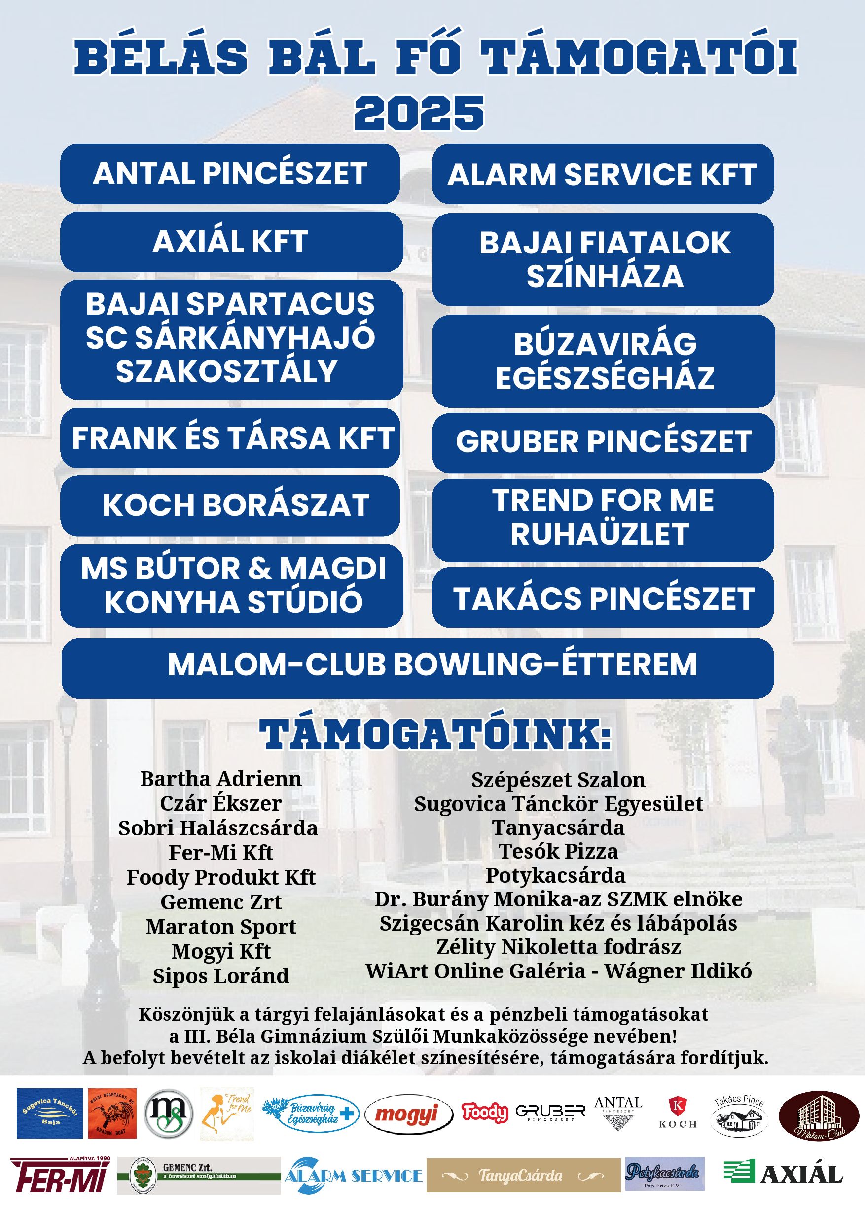 A Bajai III. Béla Gimnázium köszönetét fejezi ki a hagyományos Bélás Bál valamennyi támogatójának és közreműködő szervezeteinek. Az intézmény kiemelten szeretné kifejezni köszönetét és háláját a Malom Club nagyvonalú támogatásáért és a dolgozók odaadó, segítőkész munkájáért.