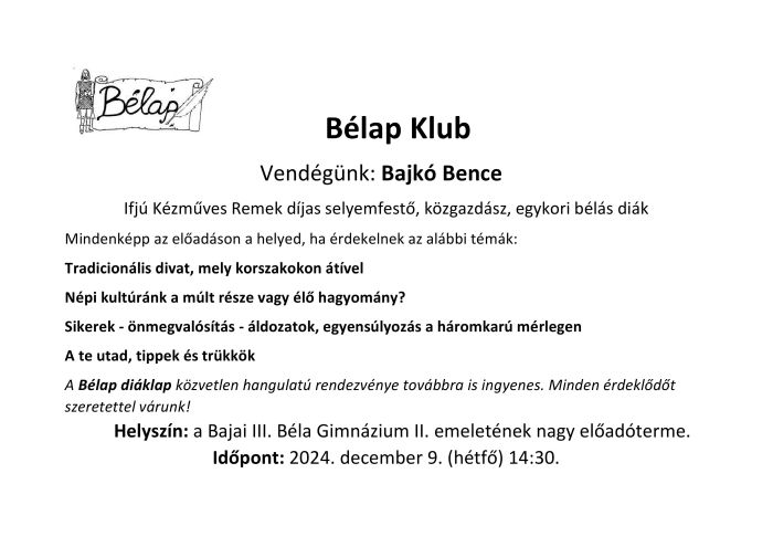 December második hétvégéjén megrendezésre került a Bélás Hagyományőrző Pingpong Gála az intézmény tornatermében. Az asztalitenisz sportág és az egészséges életmód népszerűsítése mellett fontos szerephez jutott a kapcsolatépítés és a bélás közösséghez tartozás mind a diákok, tanáraik és a volt bélás diákok között. Az ünnepélyes megnyitón dr. Munczig Dénesné, a gimnázium igazgatója köszöntötte a résztvevőket, és méltatta a hagyományőrzés jelentőségét a sportban.
