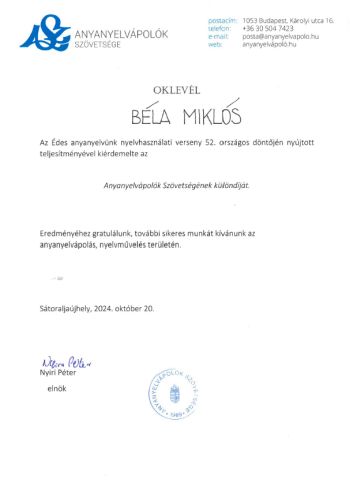 Gratulálunk a kiváló eredményhez. Bár jövőbeni elképzelései nem a nyelvtan tantárgyhoz kapcsolódnak, biztosan sokat tud hasznosítani a versenyhez kapcsolódó ismereteiből, készségeiből.