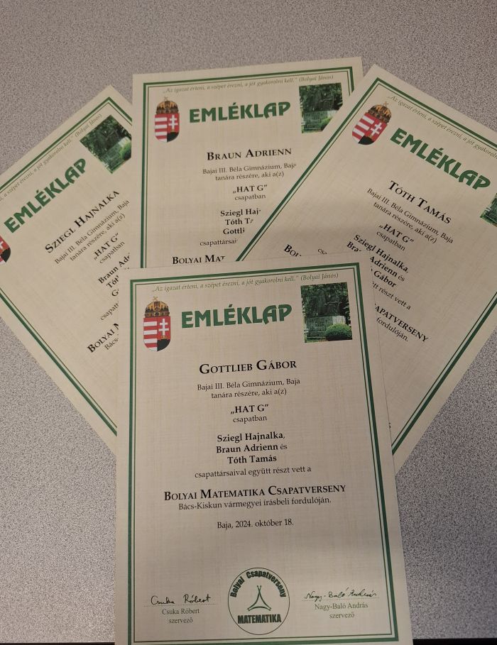 A verseny különlegessége, hogy tanárok is benevezhettek. Az idei tanévben a kiváló, országos 5. helyezést érte a „HAT G” tanárcsapat Sziegl Hajnalka, Braun Adrienn, Tóth Tamás és Gottlieb Gábor részvételével. Gratulálunk a szép eredményhez!