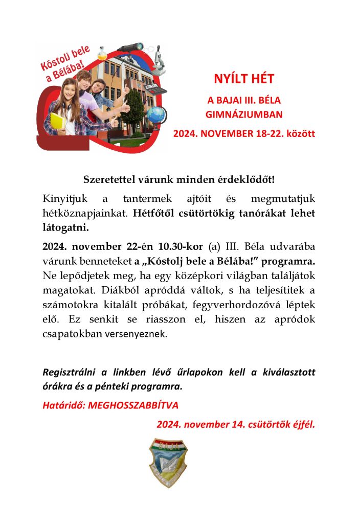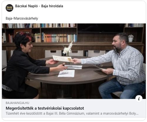 A Bajai III. Béla Gimnázium 2024. október 23-án nagy örömmel fogadta az erdélyi testvériskolák tanárait és diákjait, akikkel közösen emlékeztek meg 1956. október 23. eseményeiről. A Baja városi ünnepségen az iskola igazgatónője, Dr. Munczig Dénesné és a Bolyai Farkas Elméleti Líceum tanára, Kálmán Attila, valamint a Marosvásárhelyi Református Kollégium igazgatója, Benedek Zsolt közösen helyezett el koszorút az ‘56-os emlékműnél, ezzel is erősítve a kapcsolatukat és őrizve közös értékeiket.