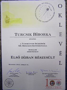 Bíborka így a tavalyi helytörténeti témájú elõadásáért kapott nagydíj után most az irodalom szekcióban is díjazott lett.