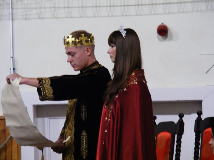 Csütörtök délután az iskolánk gólyái izgalmas kaland részesei lehettek. Augusztus folyamán az iskola udvarán kivágott fa gyökerei alatt felfedeztek egy titokzatos középkori tekercset. A tekercs varázslatával hirtelen a középkori olimpiai játékokon találták magukat, III. Béla király udvarában.