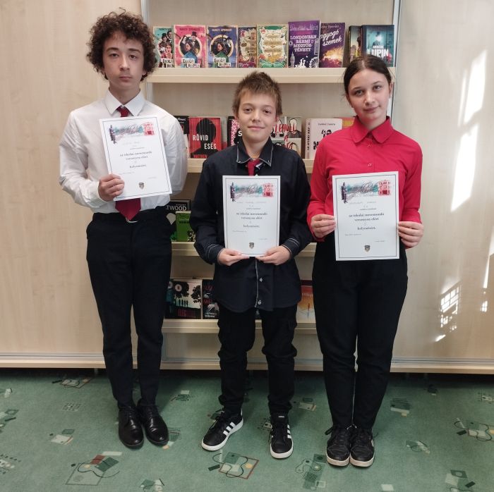 A gimnáziumunk 7-8. osztályos tanulói számára megrendezett mesemondó versenyen a következő eredmény született: 1. helyezett Sándorfi Gerda (7.A), 2. helyezett Nagy Magor Levente (7.A) -mindkettőjük tanára Lőrincz Edit, 3. helyezett Kleisz Ákos (8.A) – tanára Banga-Burány Teréz. Gratulálunk!