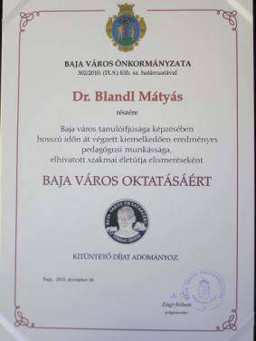 BAJA VÁROS KÖZOKTATÁSÁÉRT díjat adományozta Baja Önkormányzata.