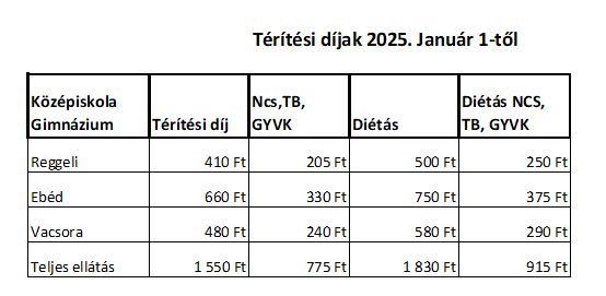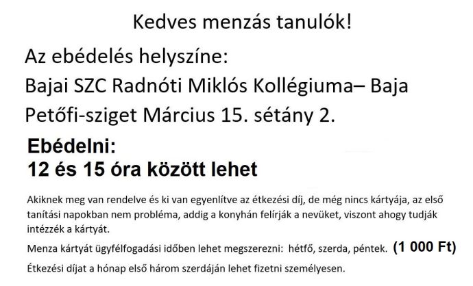 Szombati tanítás napon étkezés van, mely lemondható előző nap 9 óráig.